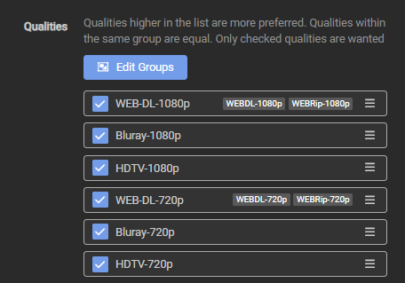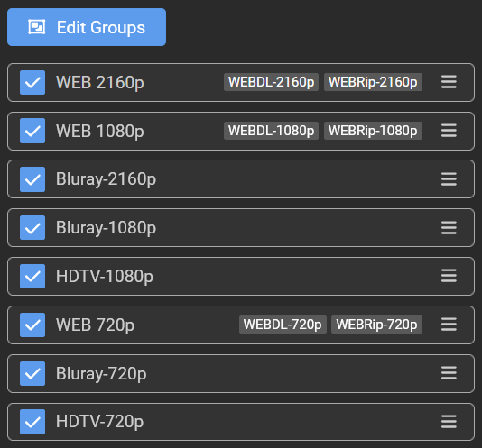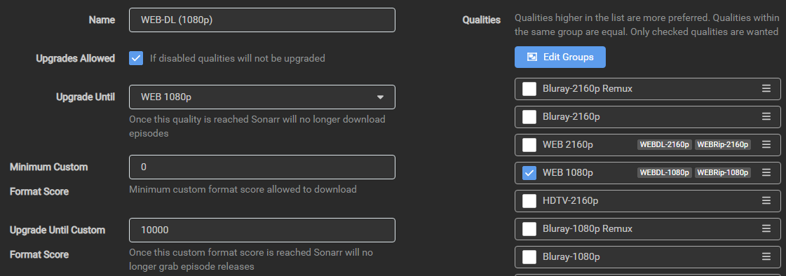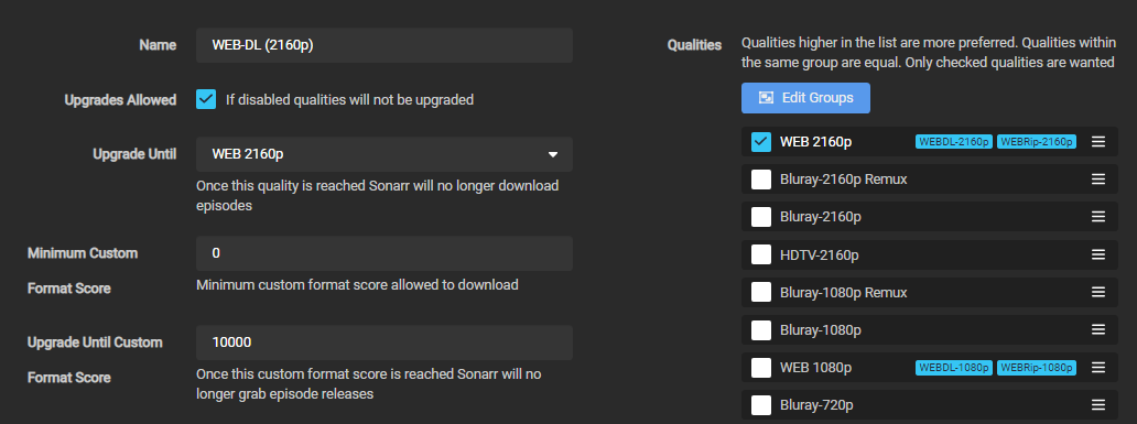 The following Quality Profiles can be combined into a single Quality Profile if you, for example, want to be able to upgrade from 1080p to 4K/2160p when and if it becomes available AFTER the 1080p release is made.