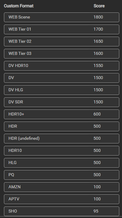 For this Quality Profile we're going to make use of the following Custom Formats with the scores given in the table.